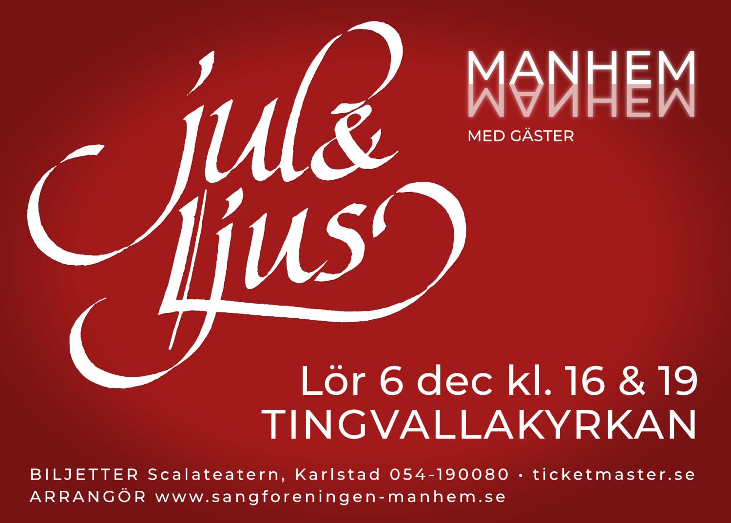 Sångföreningen Manhem sjunger in julen med JUL & LJUS! För många blir det inte någon riktig jul utan JUL & LJUS! I år ges två tillfällen i vår stämningsfulla hemvist TINGVALLAYRKAN att uppleva Jul & Ljus vilket innebär att det finns cirka 700 biljetter. Ett tips! Tveka inte utan boka redan idag då biljetterna kan […] ![]() ![]() ![]() Sångföreningen Manhem sjunger in julen med JUL & LJUS! För många blir det inte någon riktig jul utan JUL & LJUS! I år ges två tillfällen i vår stämningsfulla hemvist TINGVALLAYRKAN att uppleva Jul & Ljus vilket innebär att det finns cirka 700 biljetter. Ett tips! Tveka inte utan boka redan idag då biljetterna kan […] |